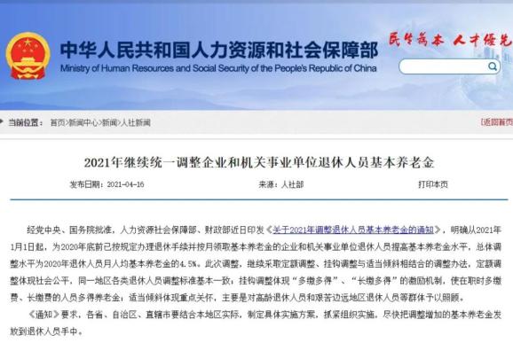 △《人社部和财政部关于2021年调整退休人员基本养老金的通知》截图。
