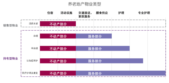 在养老地产相对成熟的美国,养老地产的物业类型按照服务的对象大致可以分为活跃长者社区(Active Adult Retirement Communities)、自理社区(Independent Living Communities)、半自理社区(Assisted Living Communities)、认知症照护社区(Memory/ Dementia Care Communities)以及护理院(Skilled Nursing Facilities)5类。