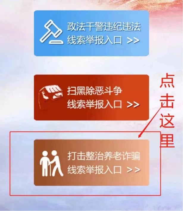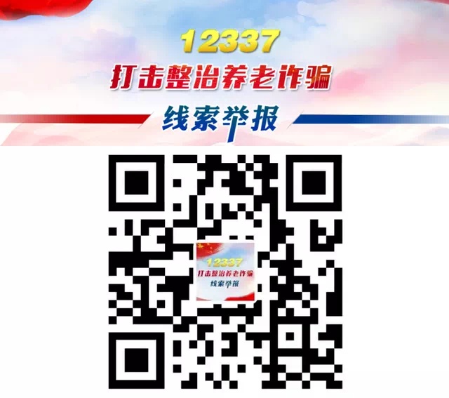 举报平台:通过点击中国长安网智能化举报平台链接(http://jyzd.12337.gov.cn/#/)、关注中央政法委长安剑微信公众号、识别下方二维码等方式,登录中央政法委12337智能化举报平台,点击“打击整治养老诈骗线索举报入口”反映问题。