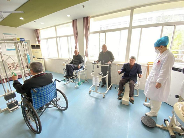 护工陪护老人使用康复器材(央广网发 射阳县民政局供图)