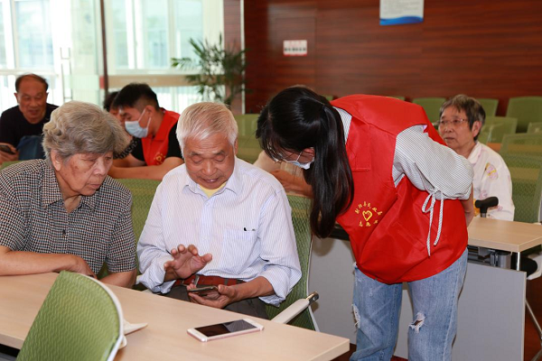 县养老中心所在的银康社区是适老型服务复合示范社区,设有医疗康复、护理、颐养、公寓、综合服务五大功能区,构建“乐龄健康生活、社区功能集成、社会能量交换”三大中心,辐射周边多个社区,为附近老人提供高质养老服务。“我们每个月都来免费剪一次头发,还能在这儿唱歌、打牌、练字,上个星期参加了一个‘智慧助老’的活动,我手机用的比老伴灵活多了,下周的健康讲座我一定拉着老伴一起来听。”