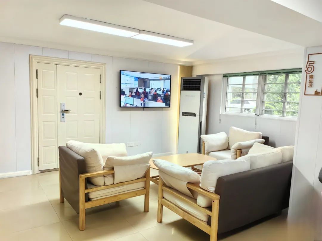 沙发+电视机,就组成了一个小小的客厅,能为社区老年人提供生活便民服务。累了就使用旁边的按摩椅,随时可以按摩,放松颈椎。