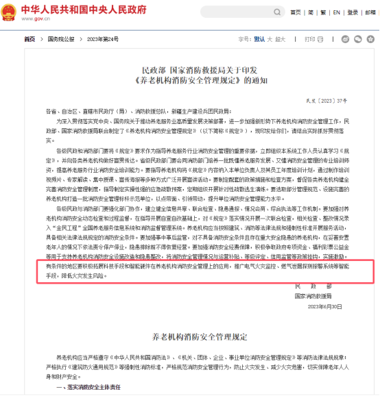 民政部国家消防救援局关于印发《养老机构消防安全管理规定》的通知中提到:“要积极拓展科技手段和智能硬件在养老机构消防安全管理上的应用,推广电气火灾监控、燃气泄漏探测报警系统等智能手段,降低火灾发生风险。”