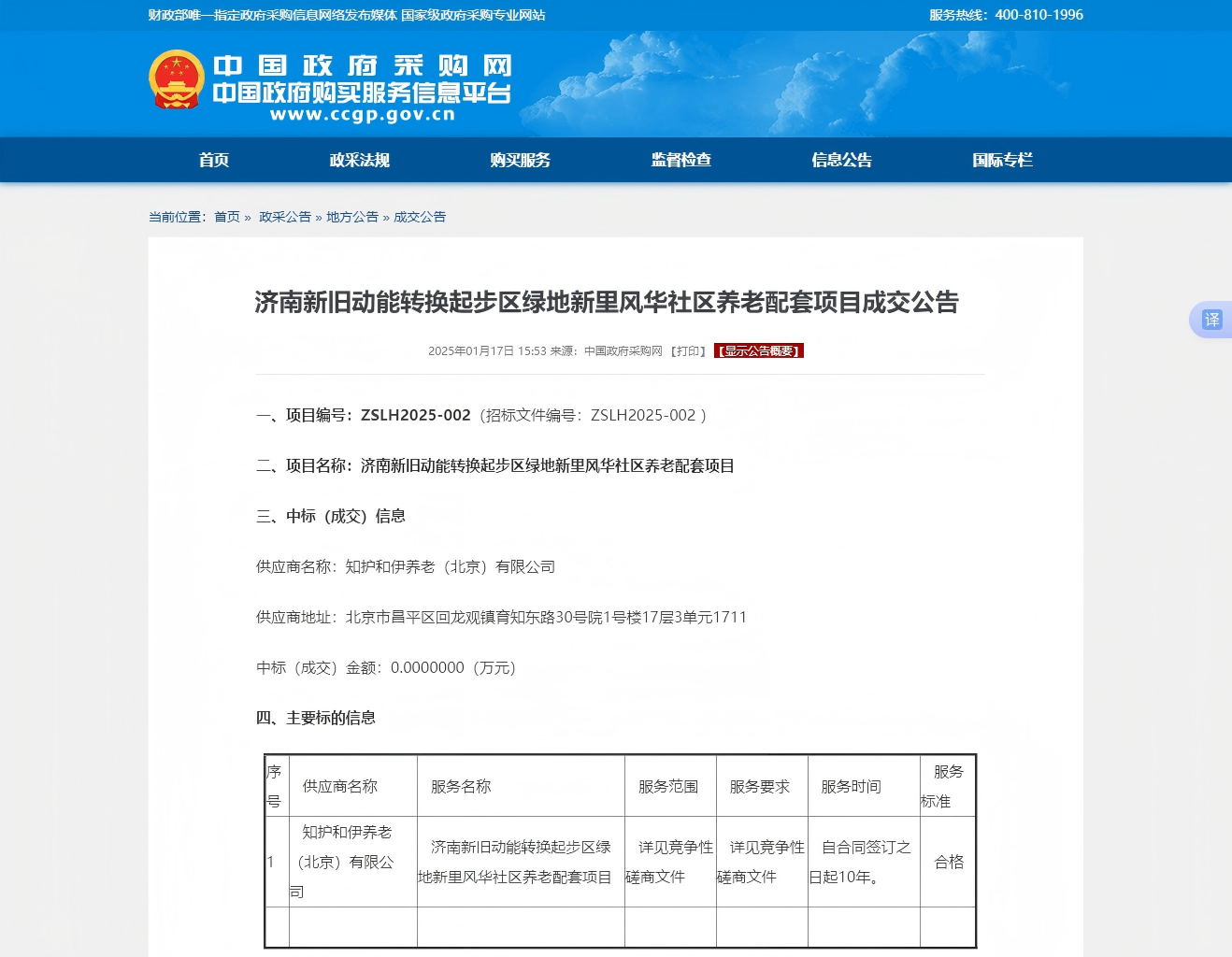 2025年1月17日,济南市起步区新里风华社区养老配套项目招标结果正式公布,知护养老凭借其卓越的运营管理能力、创新的养老服务模式及丰富的行业经验成功中标。此次合作标志着知护养老在济南市起步区养老产业布局的进一步深化,未来将为社区长者提供高品质、智慧化的养老服务,助力起步区打造现代化宜居养老示范社区。
