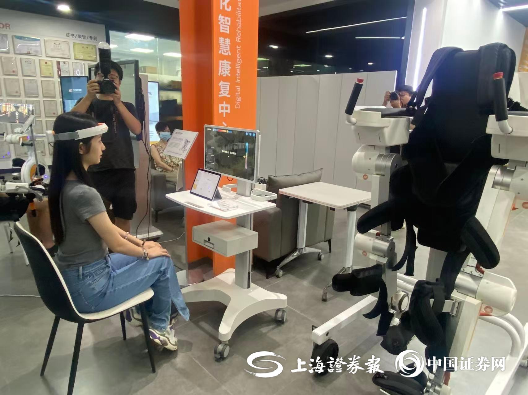 其中,一位工作人员坐在电脑旁边,头戴着脑波识别器,演示着控制一架手臂康复仪器帮助手臂做康复运动。