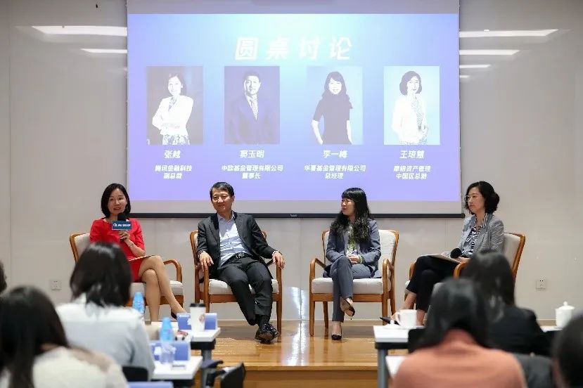 论坛环节(左起:腾讯金融科技副总裁张越、中欧基金管理有限公司董事长窦玉明、华夏基金管理有限公司总经理李一梅、摩根资管中国区总裁王琼慧)