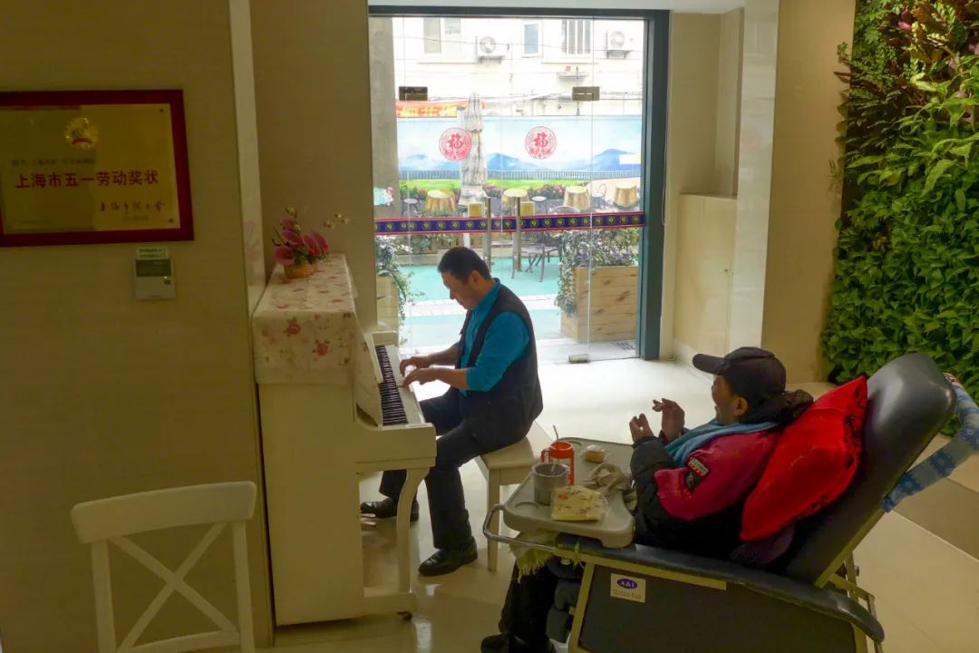 2018年1月1日,在一家社会福利院内,一位市民正在为年迈的长辈弹奏钢琴