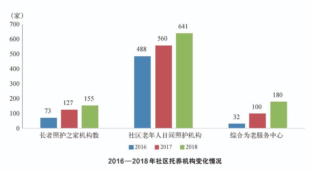 (一)社区养老机构发展迅速。2018年,上海市社区托养机构中长者照护之家共计155家,床位数4298张,比上年增加868张;社区老年人日间照护机构641家,月均服务人数2.5万人,增加0.2万人。为整合社区养老资源,大力发展社区综合为老服务中心,2018年社区综合为老服务中心180家,比上年增加80家。