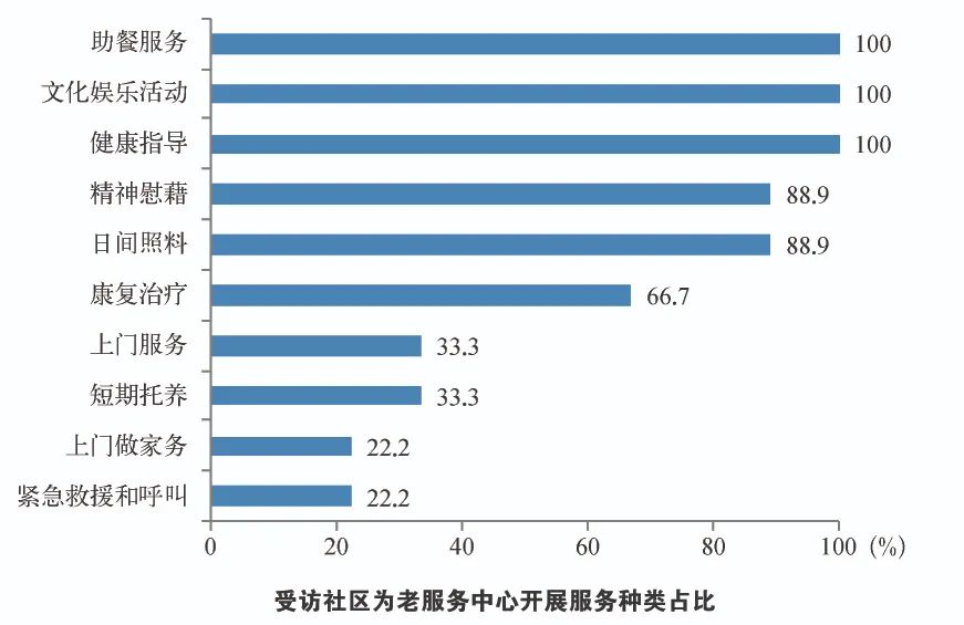 (三)社区养老资源整合优势明显。社区养老服务依托当地政府和社区,不少管理人员由当地街道、居委工作人员兼任,在资源整合上优势明显。服务形式上更趋多样化,助餐服务、健康指导、文化娱乐活动、日间照料、精神慰藉、康复治疗等服务普遍能够提供,上门服务(包括助浴、助洁、助医、助行等服务)、短期托养和紧急救援呼叫等根据所在社区养老服务的具体情况部分已开展实施。