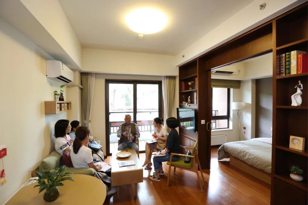 2017年6月,上海首家内环内参照五星级酒店标准建造的养老公寓在浦东开门迎客,每套间每人月缴1.8万元。图为首位签约入住者接受媒体采访