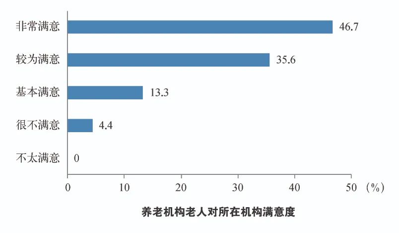 ❶ 对所在养老机构的总体满意度较高。对养老机构90名入住老人的问卷调查显示,入住老人对所在机构总体满意度较高,选择“较为满意”“非常满意”的占调查对象的82.3%,其中选择“非常满意”的占比46.7%。对45位社区养老的老人问卷调查显示,老人对社区养老的满意度更高,达到100%,其中非常满意占42.2%。