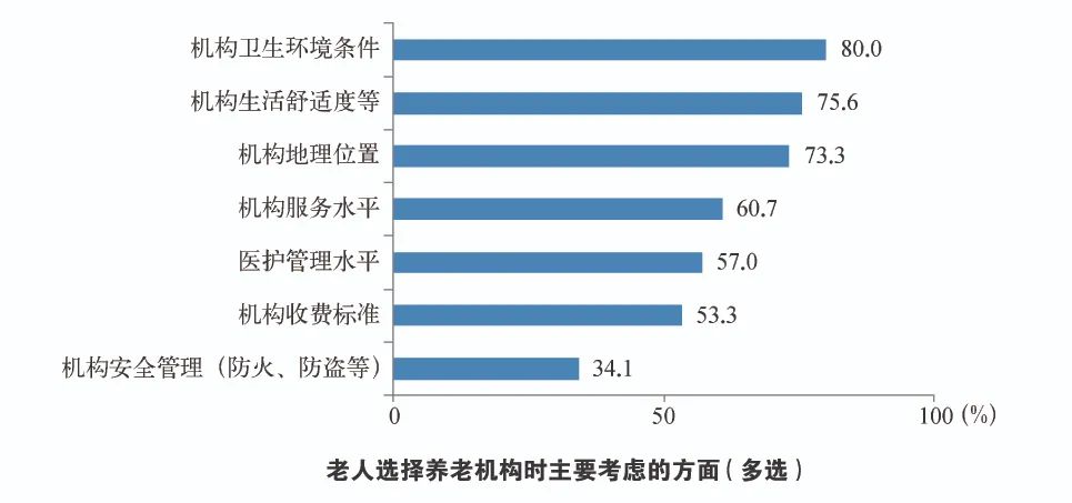 ❸ 机构卫生环境条件和生活舒适度成为选择养老机构及社区服务的主要考量因素。无论社会养老机构还是社区养老服务中心,卫生环境条件和生活舒适度都是老人选择的最重要因素,分别占调查对象的80.0%和75.6%。其次,机构地理位置、服务水平,医护管理水平、收费标准也是选择机构养老的重要因素。此外,其他入住老人的整体素质、机构内餐饮情况都成为老人选择的考量因素。