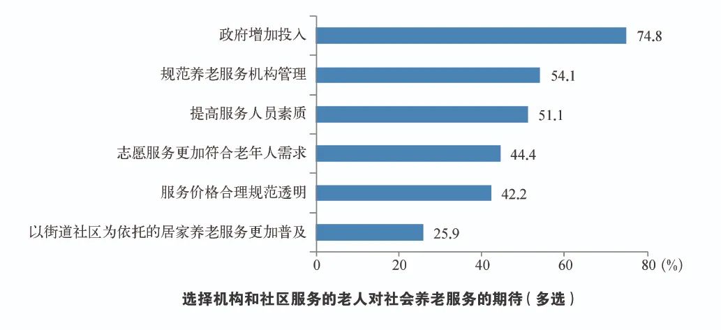 ❹ 政府增加投入是选择机构和社区服务的老人对社会养老服务的主要期望。调查显示,老人选择希望政府增加投入占调查对象的74.8%,其次规范养老服务机构管理占比54.1%,提高服务人员素质占比51.1%,志愿服务更加符合老年人需求占比44.4%,服务价格合理规范透明占比42.2%。