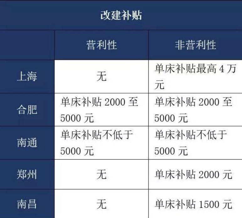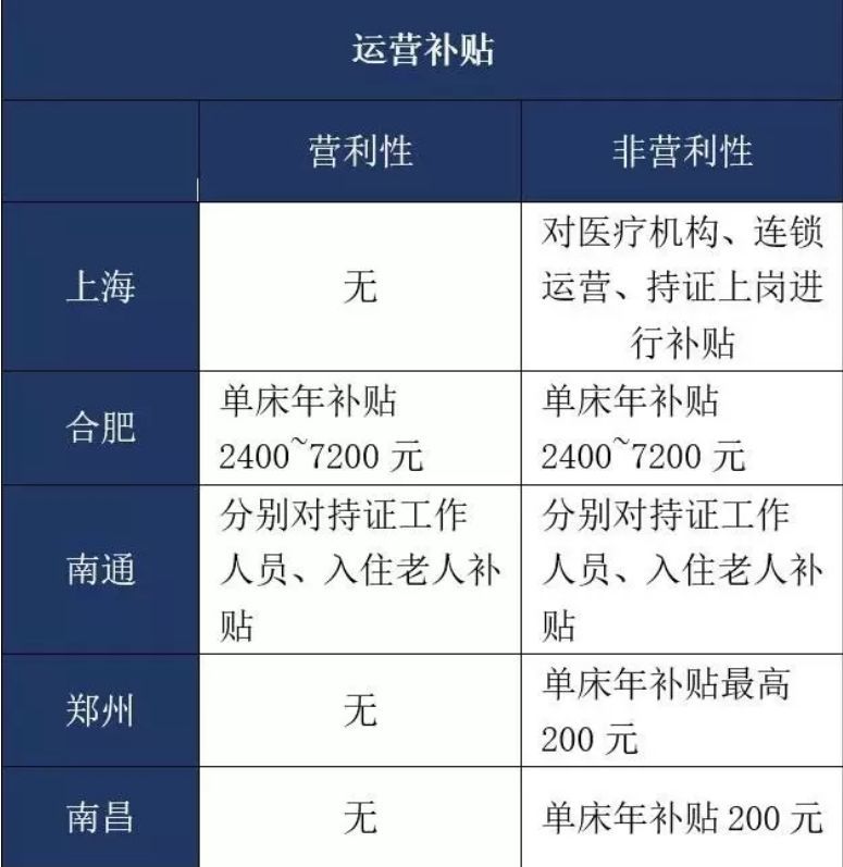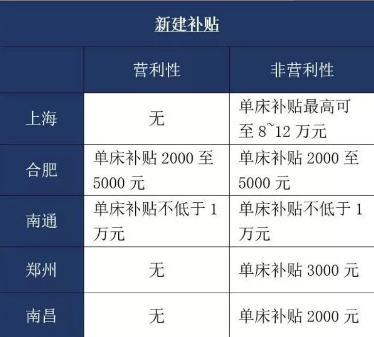那么针对营利性和非营利性的养老机构,运营补贴和建设补贴有什么不一样呢?这就很难说了,以下三表对比了上海、合肥、南通、郑州、南昌五市的补贴标准,供大家参考: