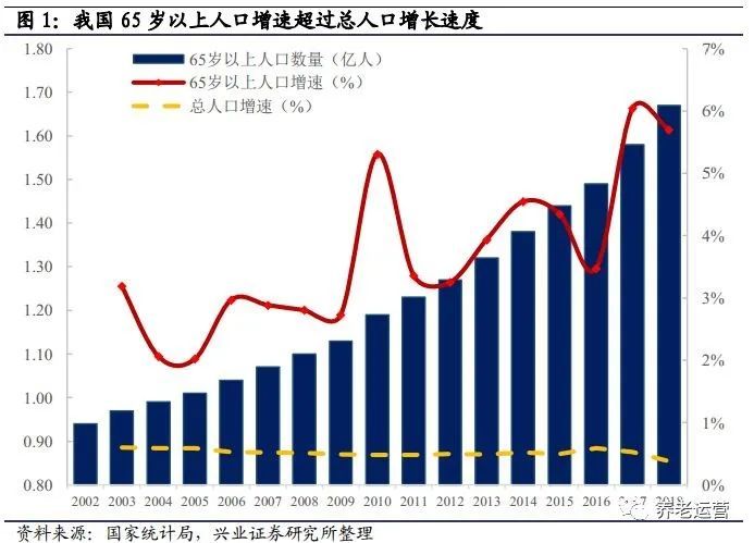 我国目前已经处于老龄化社会。按联合国标准:当一个地区60岁以上老人达到总人口的10%,或65岁老人占总人口的7%,该地区视为进入老龄化社会。我国1999年60岁以上人口已达到10.3%,标志着当年我国进入老龄化社会。受长期低生育率、不断增长的人口预期寿命以及人口年龄动态累积效应的影响,从2015年到2060年,中国的人口年龄结构将呈现出老年人口规模迅速扩大、老年人口比重持续提高以及老龄化速度远高于其他国家等显著特征。截至2018年底,我国60周岁及以上老龄人口数达到2.49亿,占总人口比重的17.9%,其中65周岁及以上老龄人口1.66亿,占总人口比重的11.9%。我国的老龄化进程正以每年新增1000万人的速度快速发展,预计2020年65岁及以上老年人口占比将达14%,整体步入深度老龄化社会。据世界卫生组织预测,到2050年,中国将有35%的人口超过60岁,成为世界上老龄化最严重的国家。