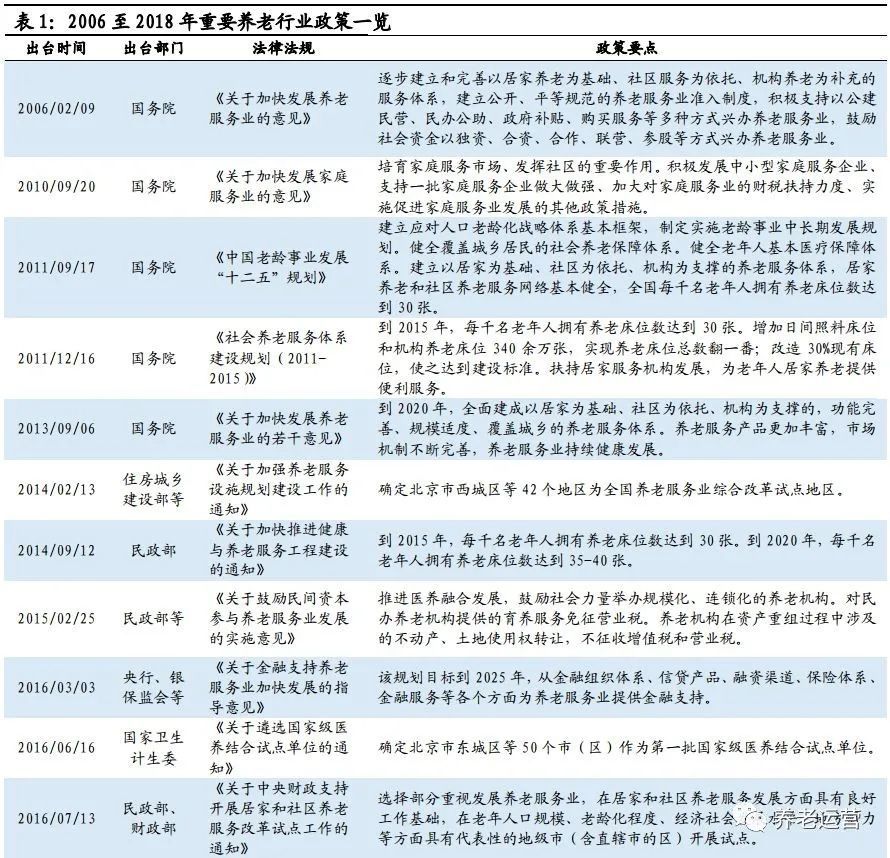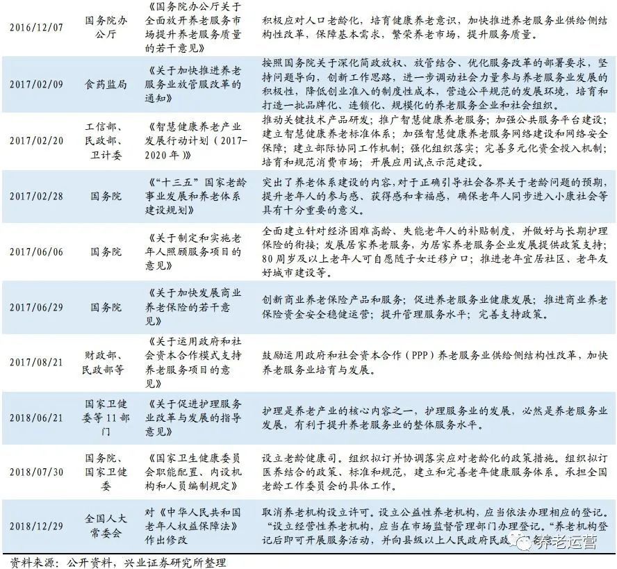 近年来随着养老产业的不断发展,养老方面的政策文件的制定与落实双双提高,凸显出社会承担养老紧迫责任。过去一两年养老产业的政策内容,放管服、医养结合、个税递延型商业保险、消费机制完善、智慧养老、养老目标基金、卫健委成立等热点不断。养老产业发展了近5年,政策内容也在框架体系不断完善的基础上,逐渐走向多元化、精细化、落地化发展,热度与执行力度双递增。相较2000年以来我国正式进入老龄化社会,我国从“老龄化”社会进入“老龄”社会再迈入“超老龄”社会,用时仅需25年和9年,老年人健康养老服务需求急速增加。2011年后国家更加密集地颁布关于养老及养老市场方面的政策。2011年至2015年国家共颁布了养老方面相关政策11篇,导向明确、力度加大。2016年国家层面就出台了7项政策,覆盖了养老服务业、社区养老、规范养老服务市场等诸多方面。从2000年左右鼓励发展,到2015年鼓励民营资本进入,定量养老服务设施建设,再到2016年确定北京市东城区等50个市(区)作为第一批国家级医养结合试点单位、2016年12月印发《关于全面放开养老服务市场提升养老服务质量的若干意见》,国家也清醒地意识到养老服务市场单靠目前的局面无法满足“老有所依、老有所养”的需求,需要依靠市场的有效介入环节供需矛盾。