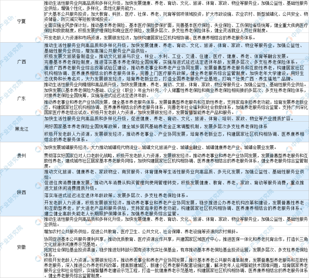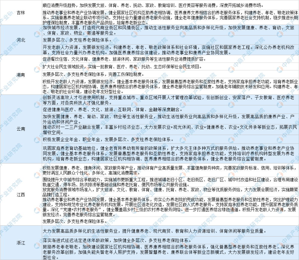 结合区域经济发展存在的差异性、养老产业面临的不同挑战和机遇,各地十四五规划建议稿在养老产业领域也呈现出诸多亮点。涉及养老产业的主要内容包括:发展多层次、多支柱养老保险体系,加快发展健康、养老等服务业,加快补齐补强农村养老等公共服务短板,积极开发老龄人力资源,发展银发经济。推动养老事业和养老产业协同发展,健全基本养老服务体系,发展普惠型养老服务和互助性养老,支持家庭承担养老功能,实施老年人居家和社区适老化改造工程,培育智慧养老等新业态新模式,构建居家社区机构相协调、医养康养相结合的养老服务体系。