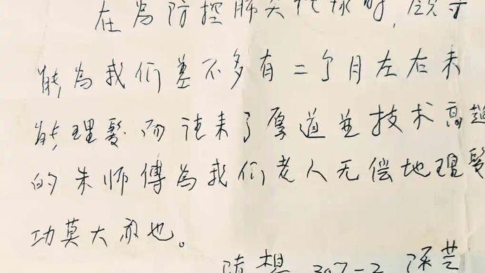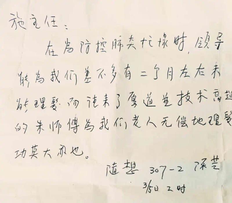“请来技术高超的朱师傅为我们老人无偿理发,功莫大焉!”3月5日学雷锋日当天,上海市第一社会福利院内90岁高龄的陈奶奶亲笔写下一封感谢信。