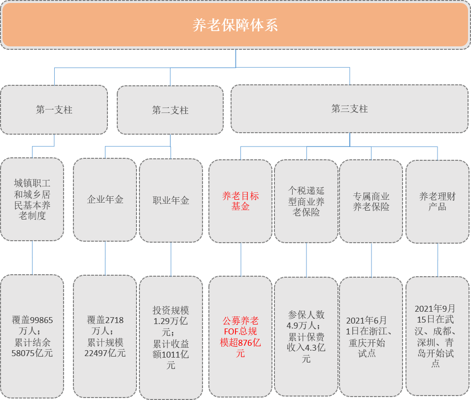 数据来源:《2020年度人力资源和社会保障事业发展统计公报》、银保监会、第一财经、大智慧(7.060, 0.00, 0.00%)(备注:养老目标基金数据截至2021年三季末;其余数据截至2020年末)
