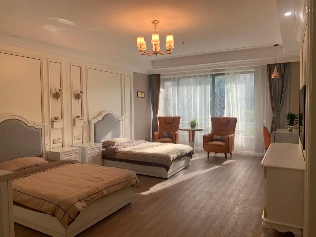 上海馨安老年公寓毗邻杨浦滨江,是“公寓式”风格的养老院。这里室外有一片漂亮的花园,铺设细细的羊肠小道,可供老人散步赏花。而在室内,以浅色调为主的雅致装潢令人心情舒缓。走进房间,欧式简约风的设计给老人营造酒店式公寓的感觉。细节方面,暖黄色的灯光、皮质扶手椅、贴心小圆桌、雪白的窗纱……处处显示着对老人生活质量的关心。