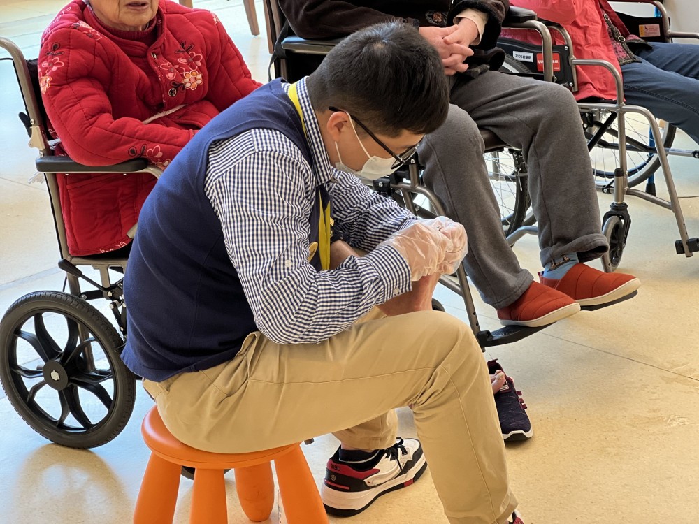 陈林为记忆照护区的老人修脚。通讯员骆晓迪 摄