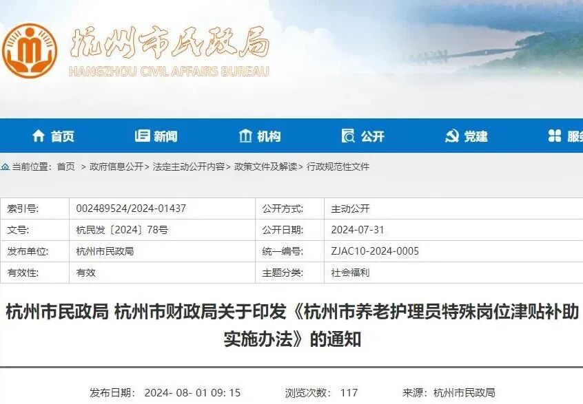近日,杭州市财政局印发《关于杭州市养老护理员特殊岗位津贴补助实施办法的通知》,明确了补助对象,制定了补助标准,规范了申请流程及管理方法等。