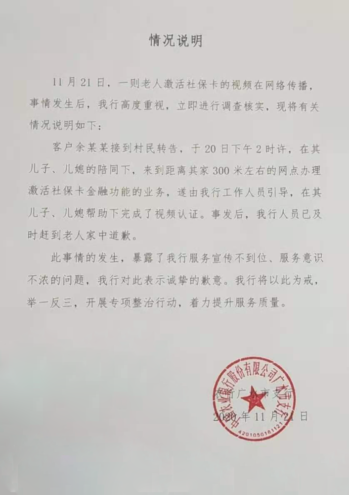 22 日,涉事银行发布情况说明,称“宣传不到位、服务意识不浓”,已及时道歉: